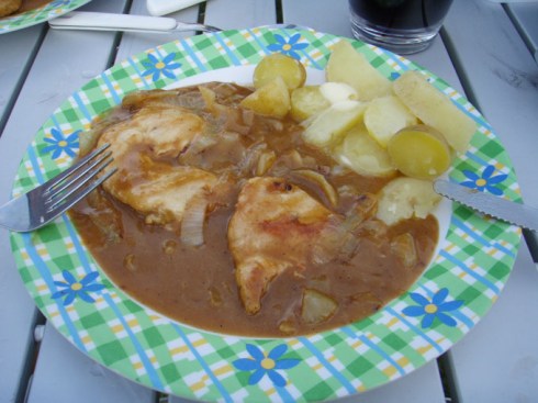 We headed back to the campsite and cooked up chicken in a satay sauce with garlic and onion. Fresh new potatoes out of Marjool’s parents back garden. Desert was rice pudding (made from yesterday’s left over rice) with fruit yogurt and a sprinkle of sugar….mmmm we know how to live it up!