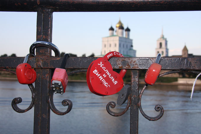 On the opposite bank of the river from the kremlin there is a railing where newly married couples stand to have their photos taken. It is traditional for them to fix a padlock on the rail as a symbol of their marriage. They either throw away the key as a sign of the permanent bond or take it home in case they change their mind !?