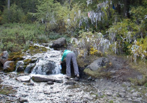 In the trees you can see the prayer ribbons they are placed their by locals for which animism is part of their religion. It is basically a primal belief in the presence of spirits or spiritual qualities in objects of the natural world, particularly peaks and springs and their spirits are thanked with token offerings (ribbons, stone cairns, coins, vodka bottles) which you commonly find around holy trees and mountain passes.