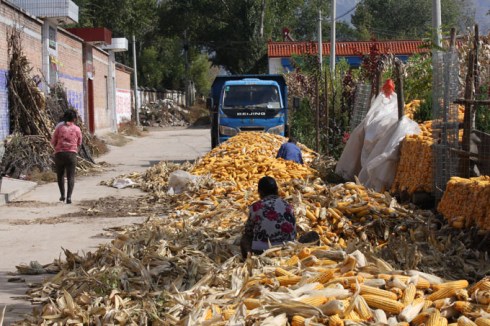 The rain started to ease to drizzle and the views improved. People were emerging and carrying on with their harvesting.