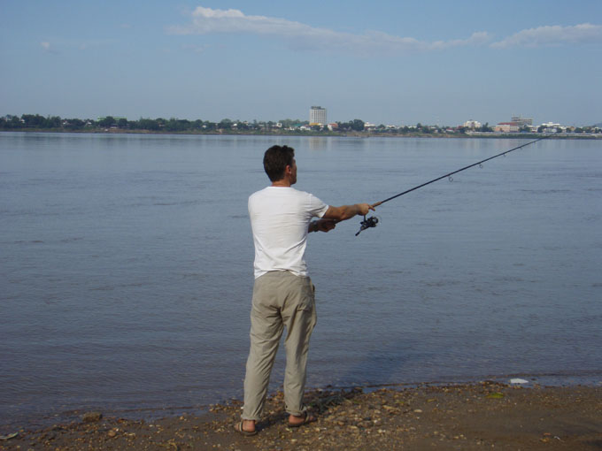 In the evening, Noy took us to the night market, a nice restaurant on the bank of the Mekong and then finally to a western (as in cowboys!) bar where they had a band playing. The bar staff were dressed in cowboy gear complete with guns. We played pool and darts with the staff. Great fun and good band.