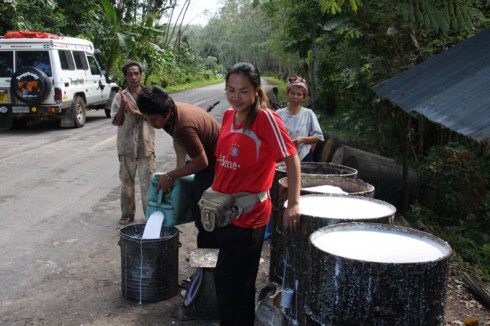 In the morning we drove on towards Phatthalung. There are lots of rubber plantations on the way and so we stopped to watch the rubber being transferred from jerry cans filled with diluted sap, into big drums for transfer into tankers and then on to the processors. It is a very distinctive, and not that pleasant a smell.