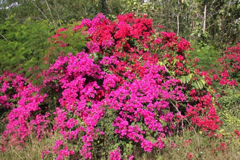 We then drove inland into the hills towards a floating market. This turned out to be a newly built tourist shopping area, so we avoided it, and instead followed signs to a fishing resort. On the way down the tracks the road went through areas of bouganvillia.