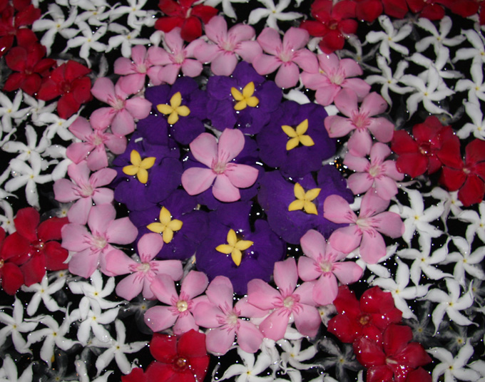 Resisting all the temptations we went back to the car and drove to the hotel again. Just by the reception there are great big stone pots filled with water. In the water there are petals of flowers floating to create different designs. It changes every day.